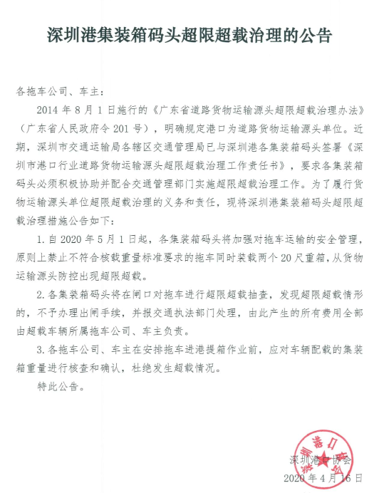 接深圳港口協(xié)會關(guān)于《深圳港集裝箱碼頭超限超載治理的公告》。