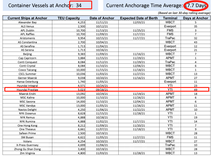 綜合性海運服務數字化平臺Sea Explorer截至11月16日的數據顯示,基于港口效率、惡劣天氣、船舶本身的情況,目前全球范圍內至少有565艘船舶等待靠泊。VesselsValue Trade和AIS數據綜合顯示,目前全球共有236.6萬TEU(國際標準箱單位)和1.816億DWT(載重噸位)因等待泊位被“擱置”,隨著全球經濟在疫情后繼續復蘇,擁堵成為影響船舶可靠性和運價的主要因素。此外,洛杉磯港的船舶平均等待泊位時間又創新紀錄,上升至17.9天,等待時間超級長的集裝箱船為"Bal Peace",等待時間長達53天。