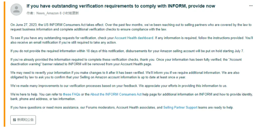 導讀: 不久前,亞馬遜向大多數美國站賣家發送了賬戶驗證電子郵件,這是因為美國制定了一項新的《消費者告知法》規定。 這項規定要求,在過去24個月中,之前未曾有過銷售的新商品或未使用商品連續銷售超過200件,且交易總額...
