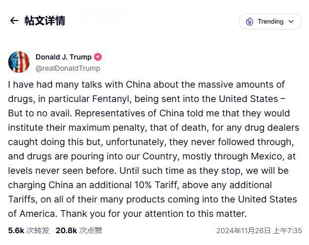 特朗普表示,將對墨西哥和加拿大進入美國的所有產品征收25%關稅。此外,特朗普還宣布將對中國商品額外征收10%的關稅。據悉,特朗普將于2025年1月20日正式上任,這將是他入主白宮后簽署的的第一個行政命令之一。