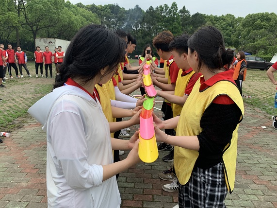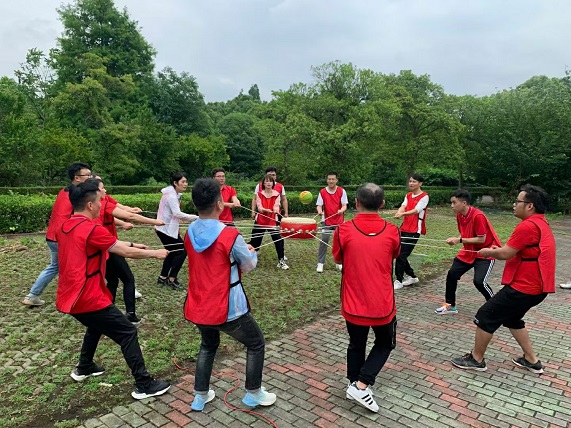 這個項目的名稱叫擊鼓顛球,也叫同心鼓,這是一個以團隊挑戰(zhàn)為主的項目,挑戰(zhàn)我們團結(jié)協(xié)作的能力。